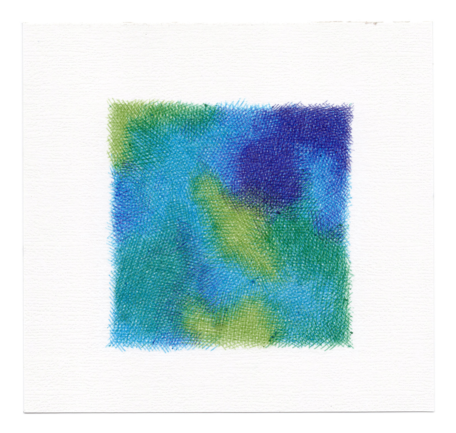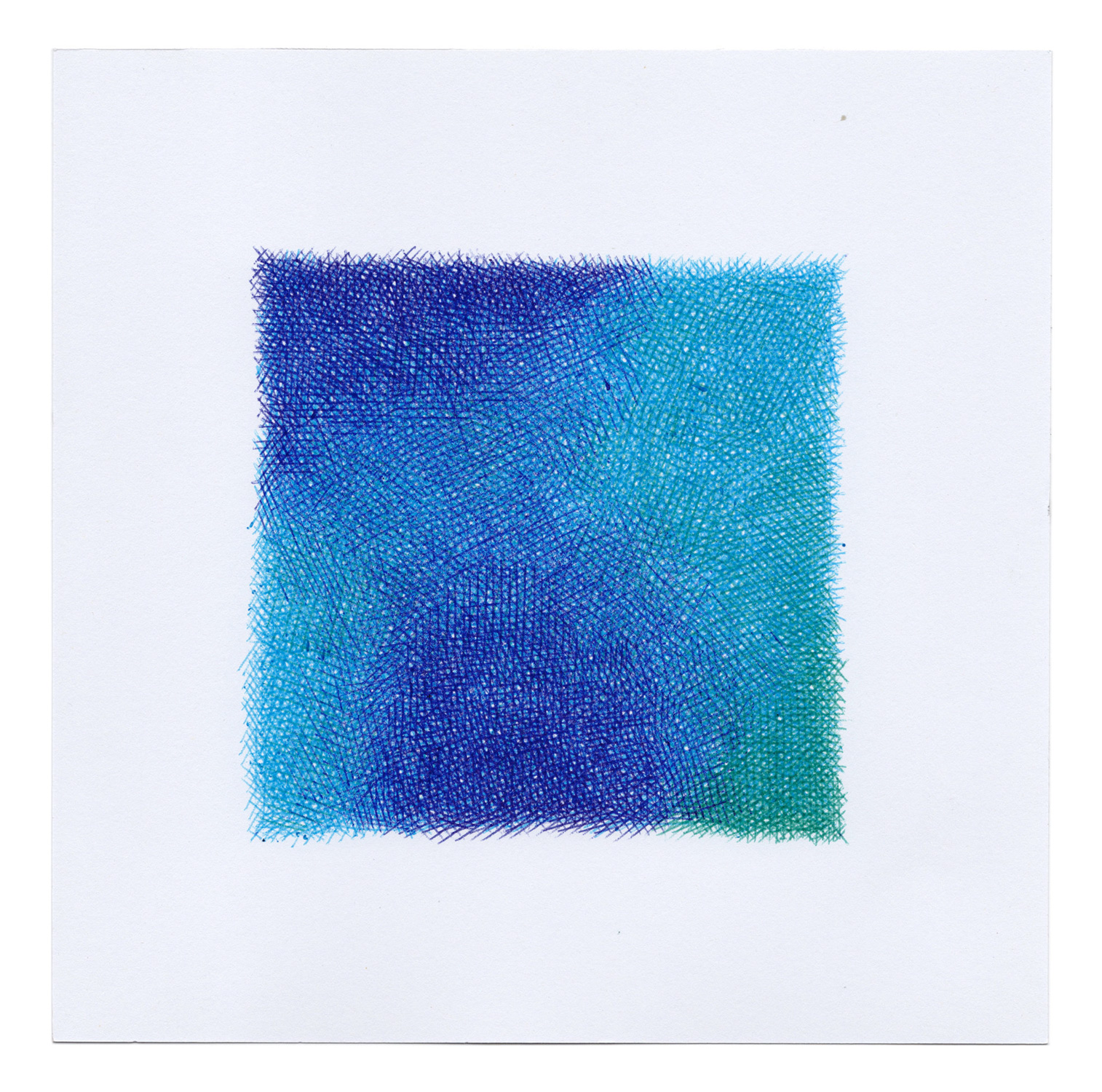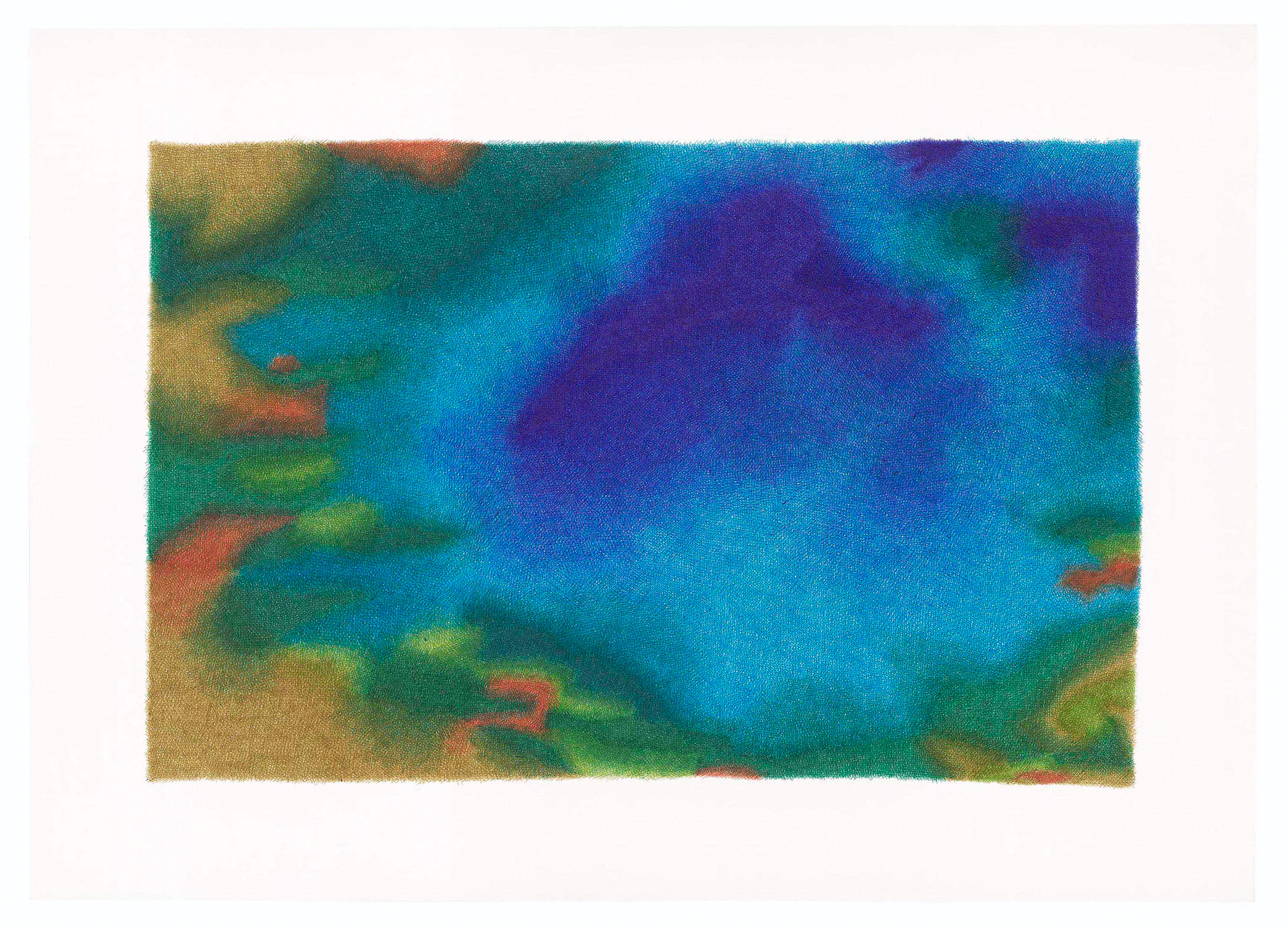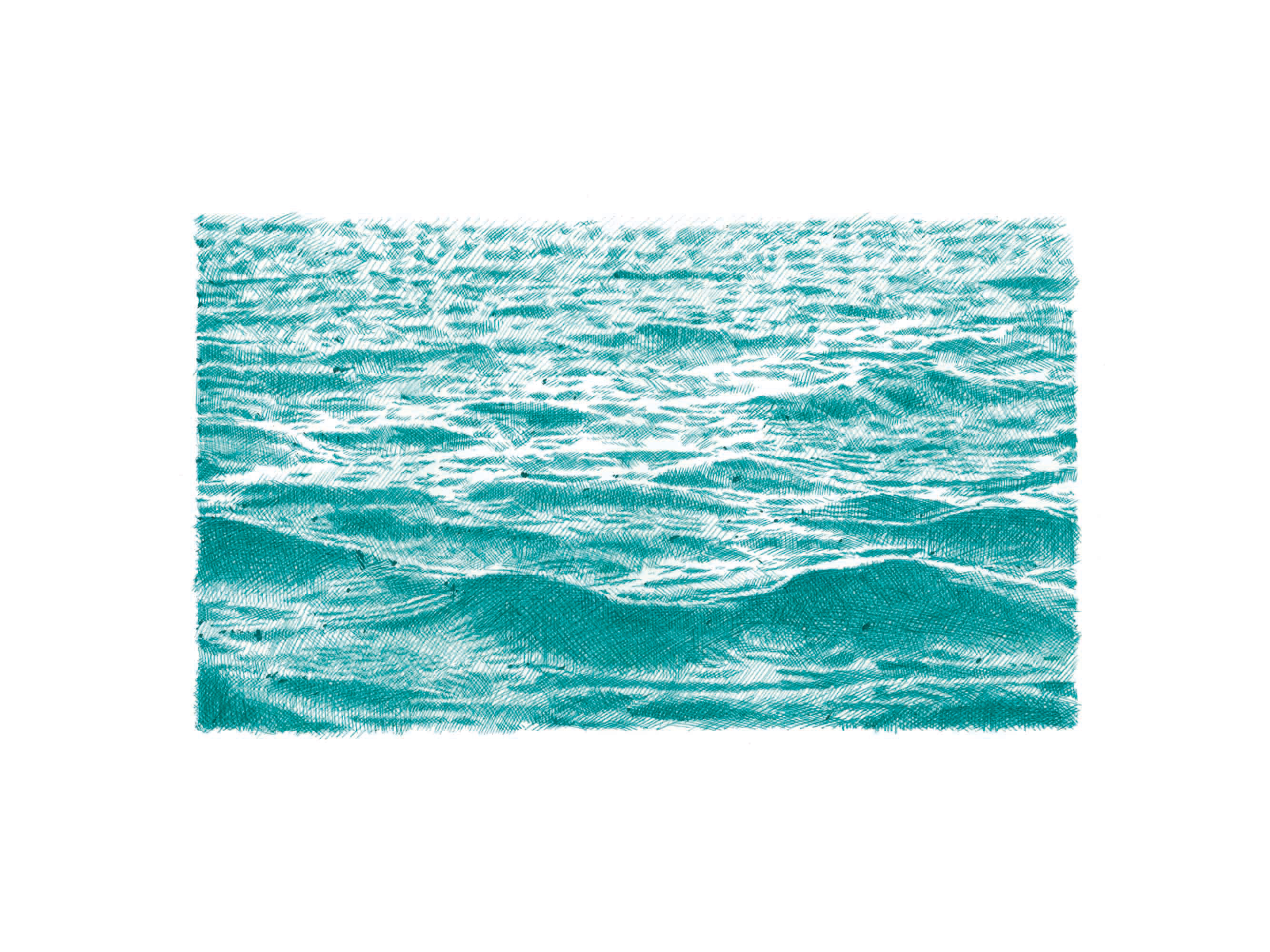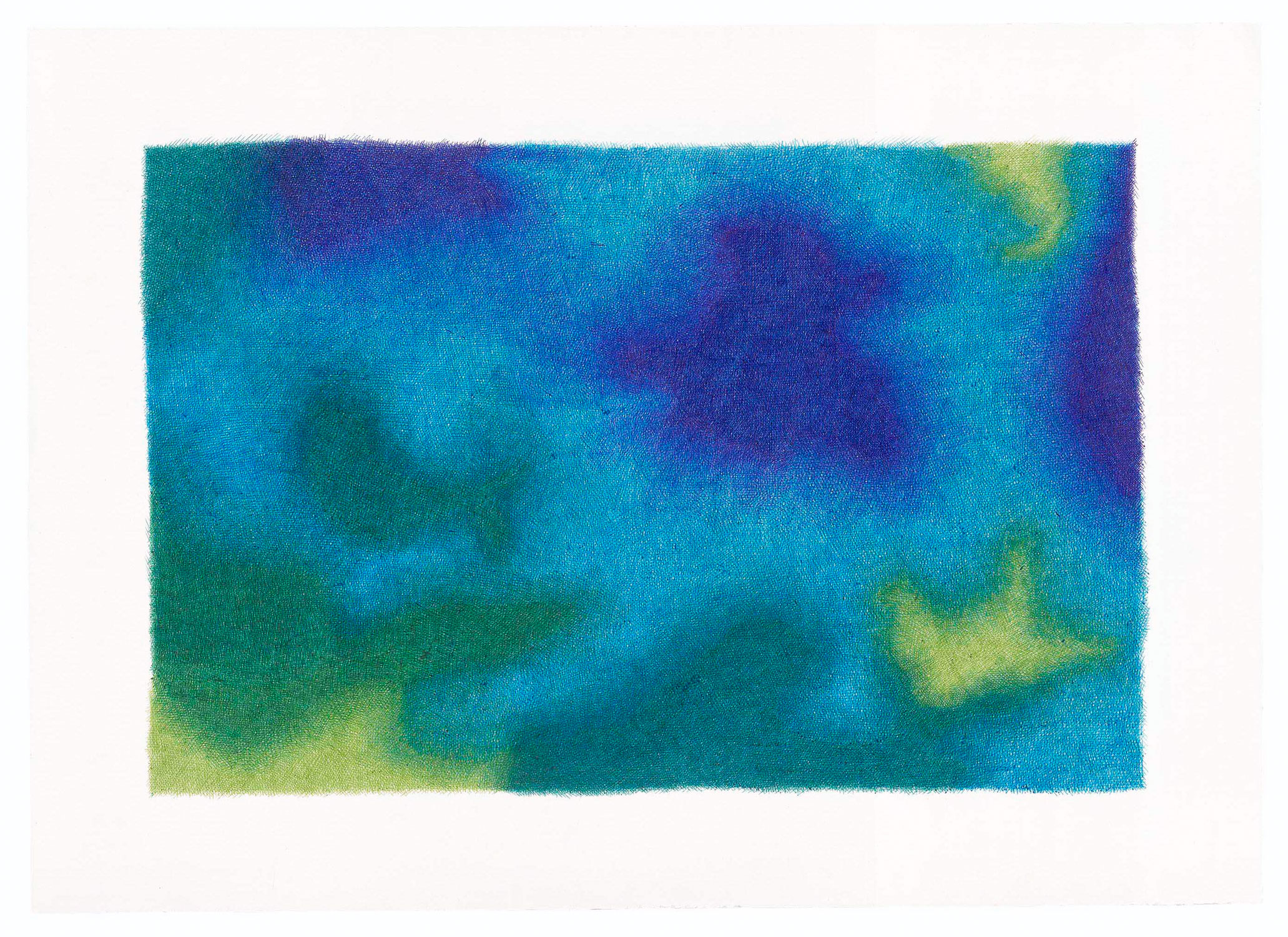 Echoing pointillism, these aquatic depths emerge through the juxtaposition of pure tones that blend into one another, creating a sense of transparency.