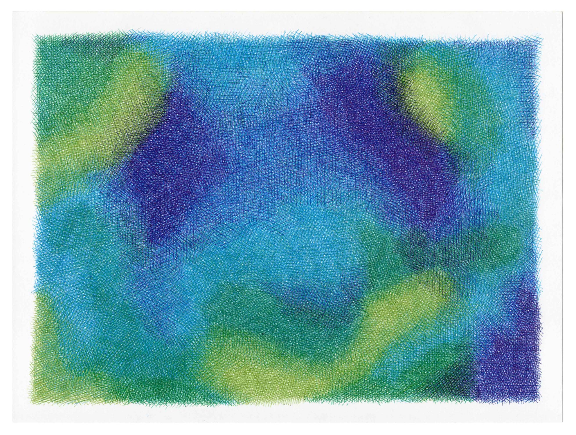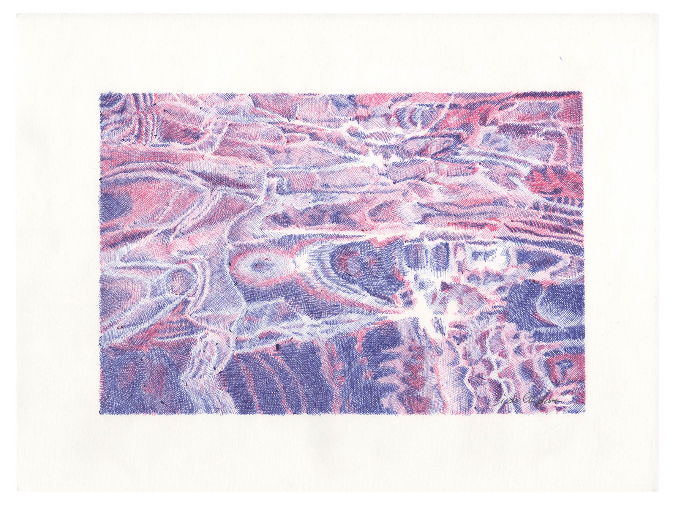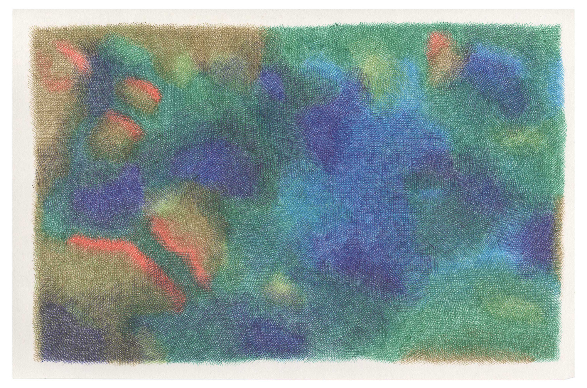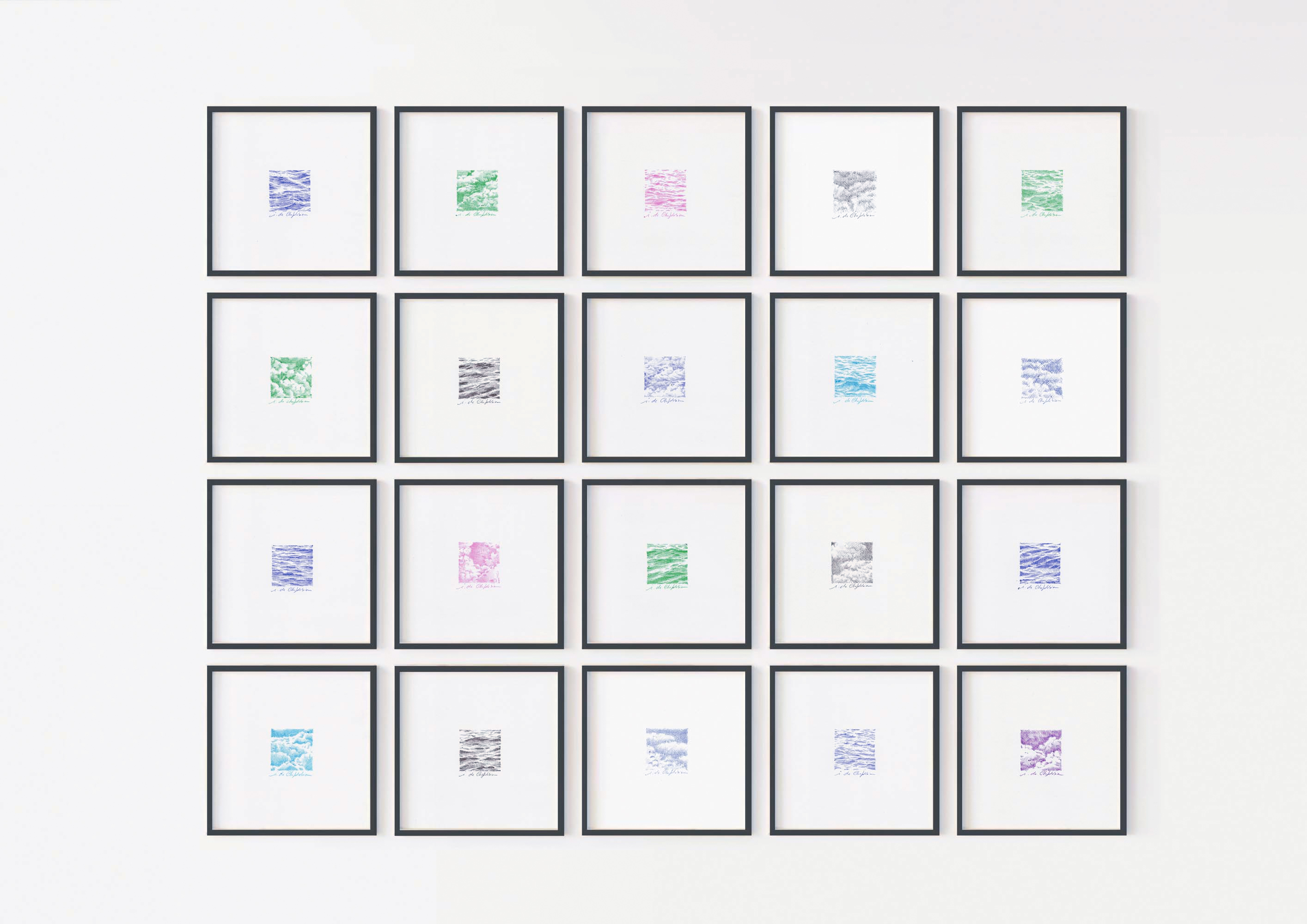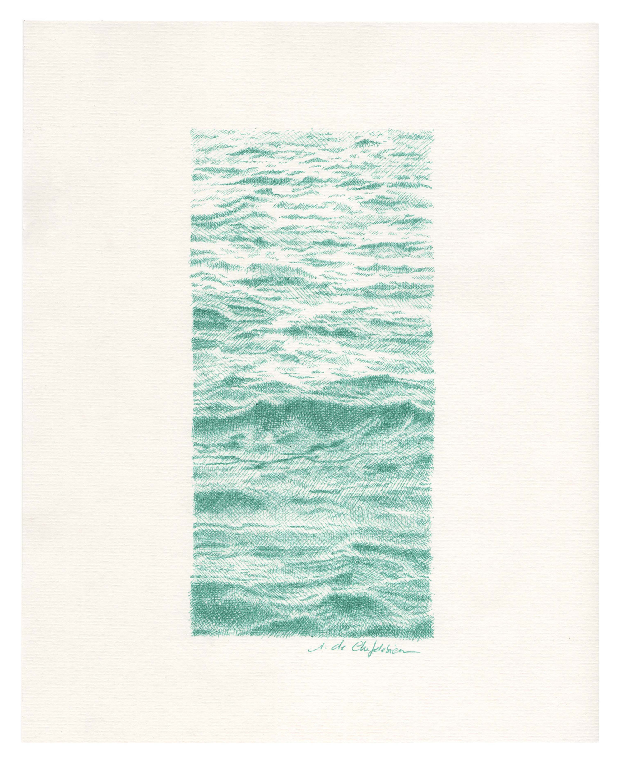 For the Sources series, which is more abstract, I drew inspiration from the vivid and deep colors of the Fosse Dionne, a wondrous spring in the town of Tonnerre. My approach remains unchanged: lines drawn with ballpoint pens.